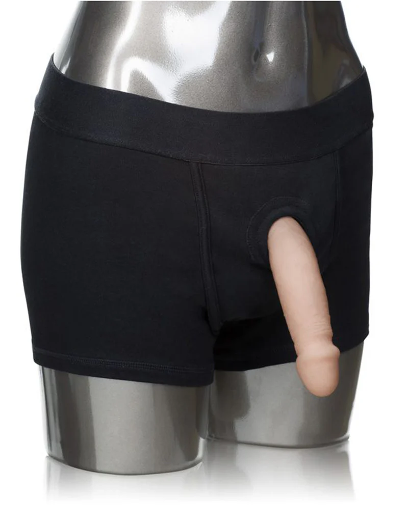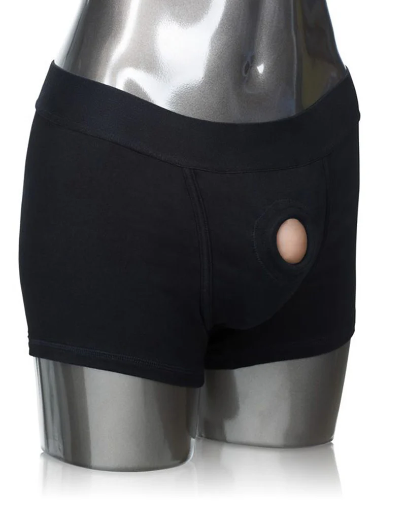 Wear your favorite packing penis with this Boxer Brief Harness by Packer Gear. This boxer brief harness gives full coverage and feels comfortable to wear. It allows you to wear your packing penis in or out of the boxer briefs. It is made of soft and stretchy cotton material. Its elastic band sits securely on or over your hips. It has a built in universal O-ring designed to fit most dildos or penis packers. Designed with internal pockets, you can also store a vibrating bullet within this harness for added stimulation. This harness is great for beginner or experienced individuals.