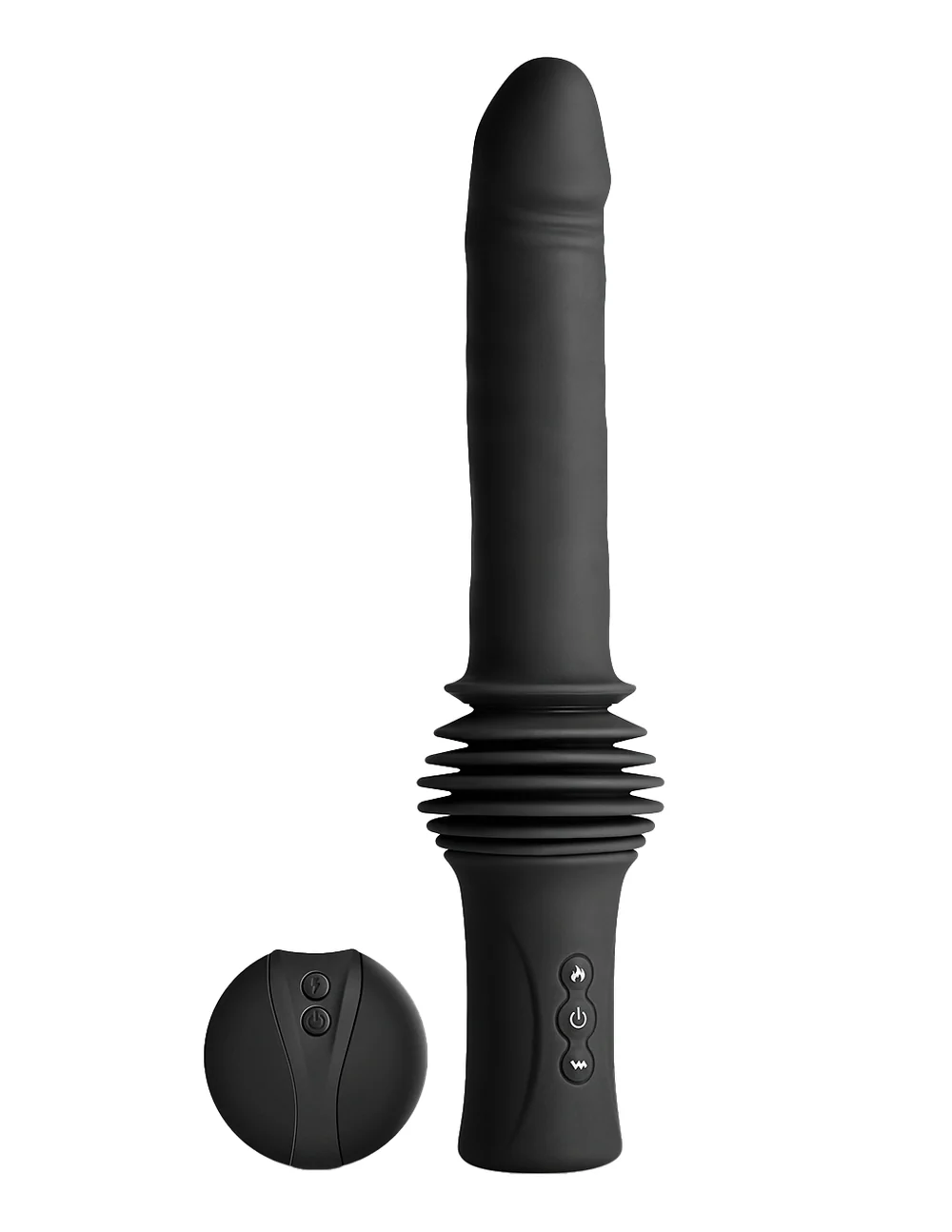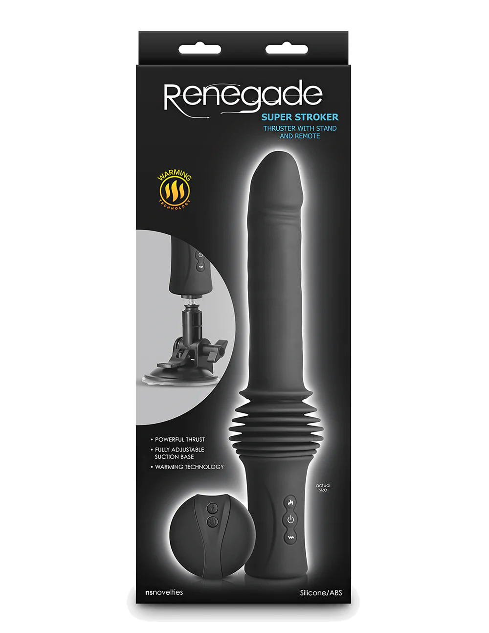 If you're feeling lusty - get warm and thrust-y with the Super Stroker from Renegade and NS Novelties: a warming, thrusting, remote controlled vibrator to satisfy any and all lovers of pleasure! Equipped with 7 escalating vibration patterns, unique warming option and 3 levels of thrust cloaked in supple silicone; this vibe includes a removable suction cup mount, turning any smooth surface into your preferred position. The 23A included battery remote allows a lover to take charge for the ultimate passion play - or can take your solo sessions to the next level as you lean back with easily one handed control. Rechargeable with the included USB cord and textured to tempt - trust this Super Stroking Thruster and NS Novelties to let out your inner Renegade!