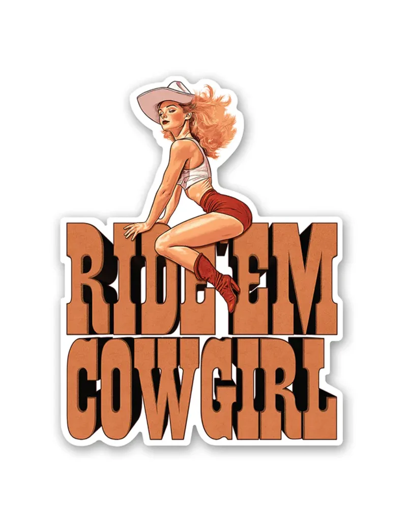Add some spice to your personal space with this waterproof vinyl sticker reading "Ride Em Cowgirl".