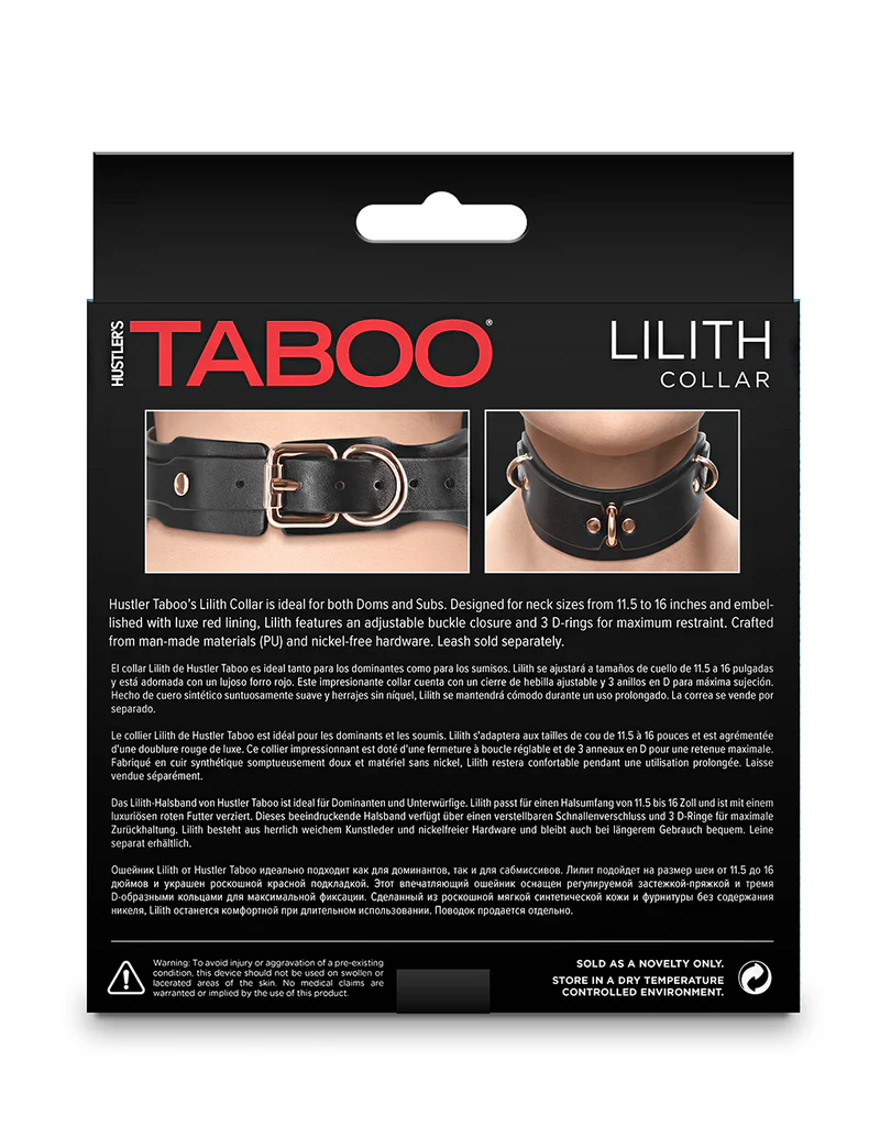 The Taboo Lilith wraps around your neck with a luxurious feel and sophisticated look. Crafted with a PU leather exterior and a soft red lining, this collar is both comfortable and stylish. Featuring an adjustable buckle closure, wearable length of 11.5" - 16" and three nickle-free D-rings to connect to any leash or restraint, this collar is perfect for creating an unforgettable fantasy experience. Explore trust, Dominance, submission, and pleasure with a timeless piece you can trust from