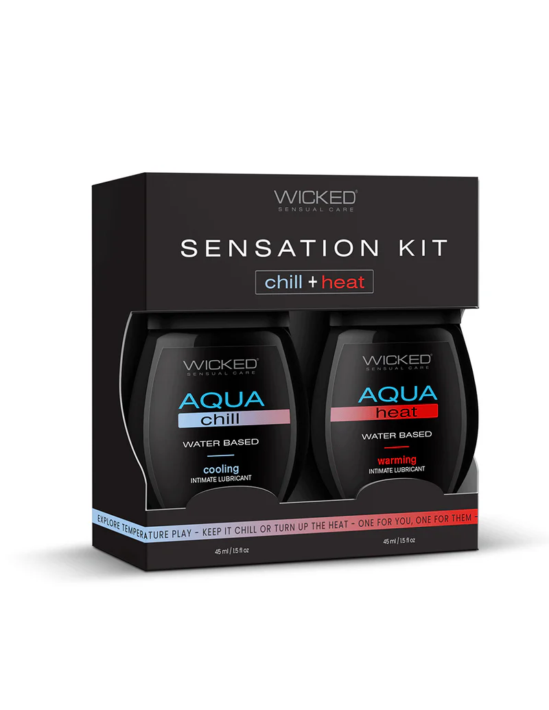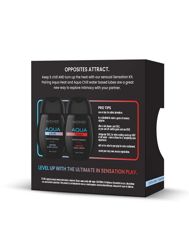 Keep it chill and turn up the heat with Wicked Sensations Warming & Cooling Lubricant Kit. This kit offers a whole new way to explore intimacy with your partner. Get creative with these versatile lubes: use them on toys for added excitement, or try a blindfold for sensory surprise. After a hot shower, cool down with CHILL and switch things up with HEAT. For an extra thrill, refrigerate CHILL or warm up HEAT in hot water for a totally new experience. Add an ice cube to your play for some extra fun, and create your own unique sensory journey.