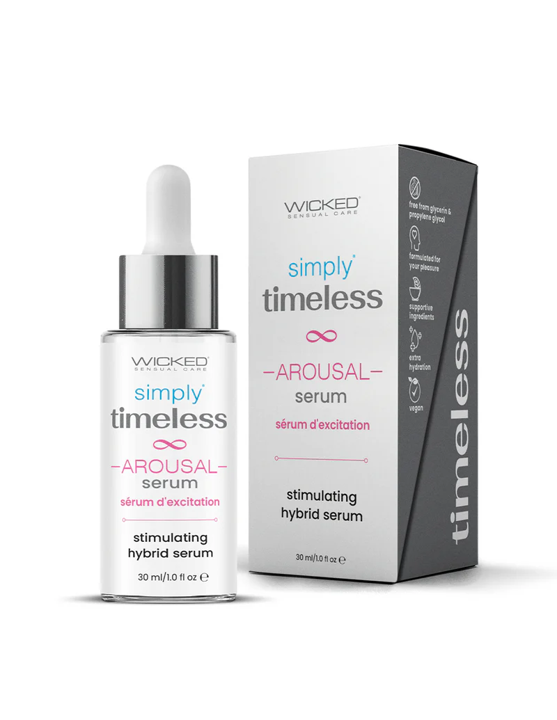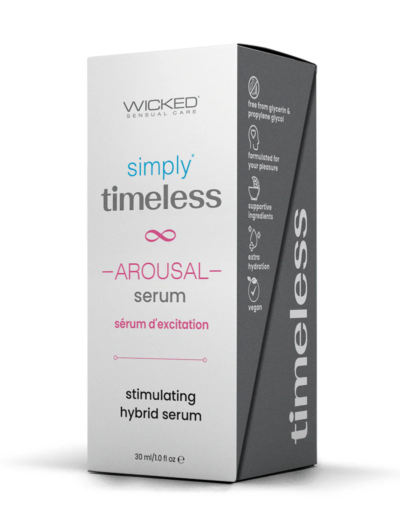 Because your glow doesnβt stop, and neither should your pleasure. Rediscover comfort and connection with Wicked Simply Timeless Arousal Serum, thoughtfully designed to support changing bodies through every stage. This hybrid warming serum delivers a gentle, stimulating sensation that helps enhance arousal while easing dryness. Infused with amino acids, peptides, and nourishing ingredients like aloe, squalane, and Vitamin E, it cares for delicate skin while you play. Its lightweight formula absorbs smoothly, leaving you feeling soft, hydrated, and refreshed. Safe for regular use, it can even double as a daily moisturizer for ongoing comfort. Clean, effective, and intentionally formulated, itβs a modern essential for elevated intimacy.